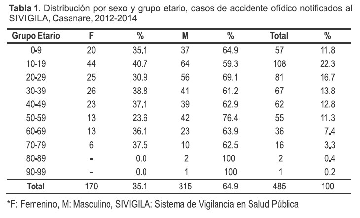 Tabla 1. Distribución por sexo y grupo etario, casos de accidente ofídico notificados al SIVIGILA, Casanare, 2012-2014