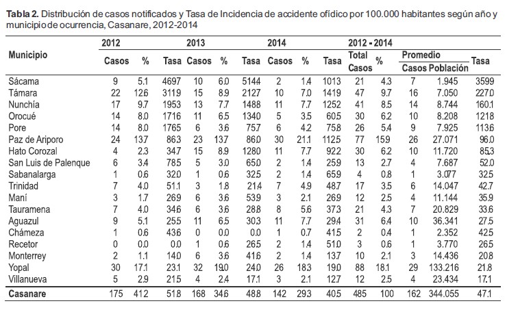 Tabla 2. Distribución de casos notificados y Tasa de Incidencia de accidente ofídico por 100.000 habitantes según año y municipio de ocurrencia, Casanare, 2012-2014