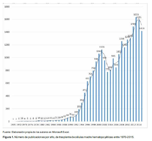 Figura 1. Número de publicaciones por año, de trasplante de células madre hematopoyéticas entre 1970-2015