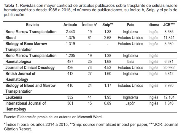 Las revistas de alto impacto como Lancet, New England Journal of Medicine, Nature o Journal of the American Medical Association, ocuparon los puestos 34, 35, 159 y 110 respectivamente, en relación a la cantidad de artículos publicados. La revista que obtuvo la mayor cantidad de citas, mayor impacto en las citas de sus publicaciones (SNIP) y mayor factor de impacto (JCR) fue la revista Journal of Clinical Oncology seguida por la Revista Blood. Las revistas con mayor número de publicaciones contaron con un mínimo de 300 artículos sobre TCMH, además se muestra el número de referencias en torno al tema, idioma, índice h, SNIP y JCR (Tabla 1).