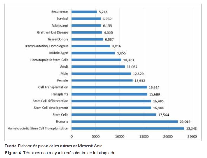 Los términos o palabras clave con las que se registraron los artículos de mayor interés dentro de la búsqueda fueron: TCMH, registrado en 23,345 publicaciones, humanos en 22,019 y células madre en 17,564 (Figura 4). En relación a los términos, se observó que la palabra hematología se encontró en 139,913 publicaciones, células madre en 295,182 y trasplante de precursores hematopoyéticos en 45,056 lo que representó un 32.20% respecto a hematología.