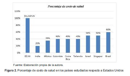 Figura 2. Porcentaje de costo de salud en los países estudiados respecto a Estados Unidos