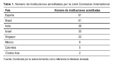 La Joint Commission International (JCI) es la entidad mundial encargada de la acreditación de las instituciones prestadoras de servicios de salud. La certificación y acreditación ante la JCI es un proceso que las organizaciones de salud deben realizar con el fin de certificar su capacidad de prestar servicios de salud de calidad, que garanticen un entorno seguro para el paciente, el personal y las visitas; cabe destacar que este es un proceso al que se someten las instituciones de salud de manera voluntaria (34). De acuerdo a lo anterior se evaluó la variable calidad de servicios y acreditaciones, encontrando que Brasil y España los países que cuentan con más instituciones acreditadas por la JCI, seguidos de India, Israel y Singapur, en la Tabla 1se relaciona el número de instituciones acreditadas por la JCI en cada uno de los países evaluados y en la Tabla 2se relacionan cuáles son las instituciones que en Colombia se encuentran acreditadas por la JCI (35).