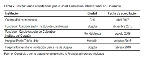 Tabla 2. Instituciones acreditadas por la Joint Comission International en Colombia
