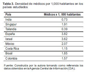 Tabla 3. Densidad de médicos por 1,000 habitantes en los países estudiados