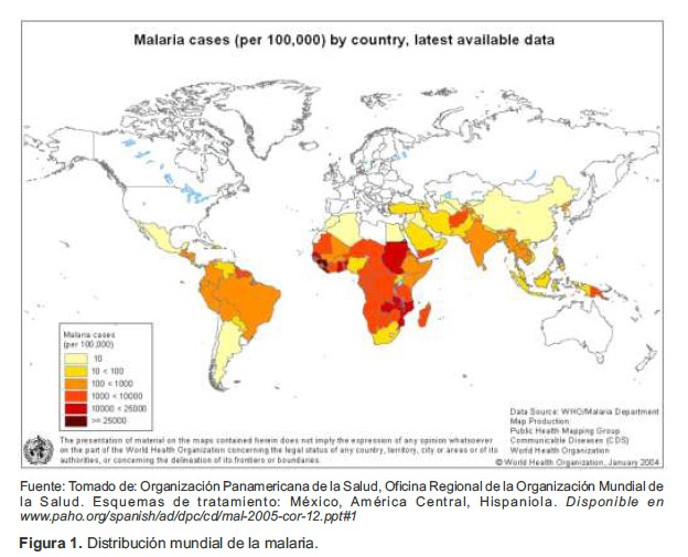 Desde los cimientos de la medicina clásica, algunos médicos como Hipócrates; pensaron que era atribuida a los miasmas o “aires malos” de las lagunas y pantanos de donde provienen sus nombres, malaria (mal aire) y paludismo (plauster o pantano) (1). La malaria es una enfermedad infecciosa transmitida por el mosquito hembra del género Anopheles. Existen cinco especies de Plasmodium de interés médico (2), con un espectro endémico en 91 países, que ponen en riesgo al 40% de la población mundial (3)(Figura 1).