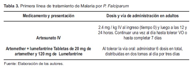 Tabla 3. Primera línea de tratamiento de Malaria por P. Falciparum