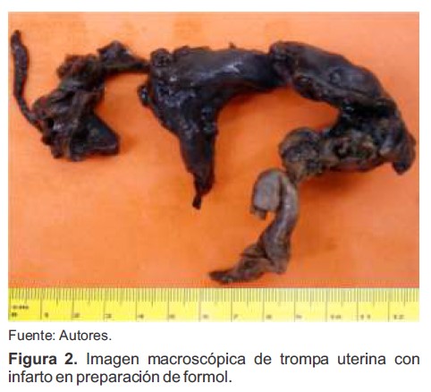 Figura 2.Imagen macroscópica de trompa uterina con infarto en preparación de formol