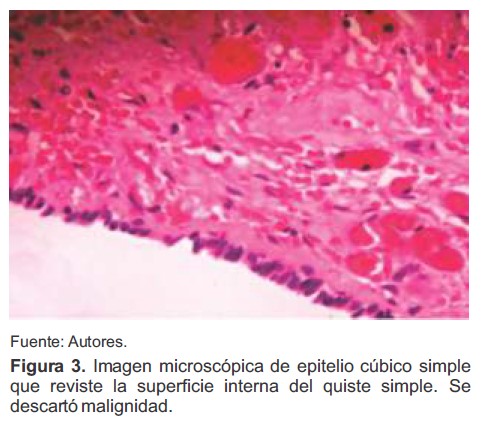 Figura 3. Imagen microscópica de epitelio cúbico simple que reviste la superficie interna del quiste simple. Se descartó malignidad.