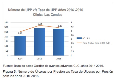 Cabe destacar que, a fines del año 2014, Clínica las Condes realiza la apertura de su nuevo edificio, el cual dobla la capacidad de las camas de cuidados intensivos y de cuidados intermedios adultos, lo que a su vez se traduce en un aumento de los días cama utilizados por los pacientes y en un aumento de la dotación de personal para estas unidades. Por consiguiente, el número de reportes del evento úlcera por presión aumentó momentáneamente durante el año 2015, pero su tendencia vuelve a la baja desde el año 2016, es por esta razón que el valor de la tasa se reduce, en conjunto con el valor absoluto del evento.