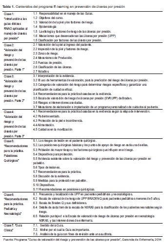 Tabla 1. Contenidos del programa E-learning en prevención de úlceras por presión