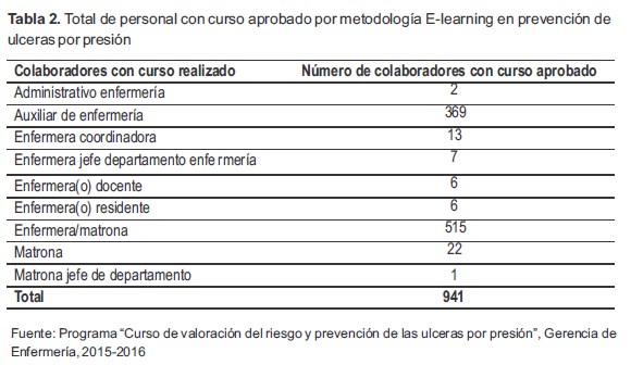 Tabla 2. Total de personal con curso aprobado por metodología E-learning en prevención de ulceras por presión
