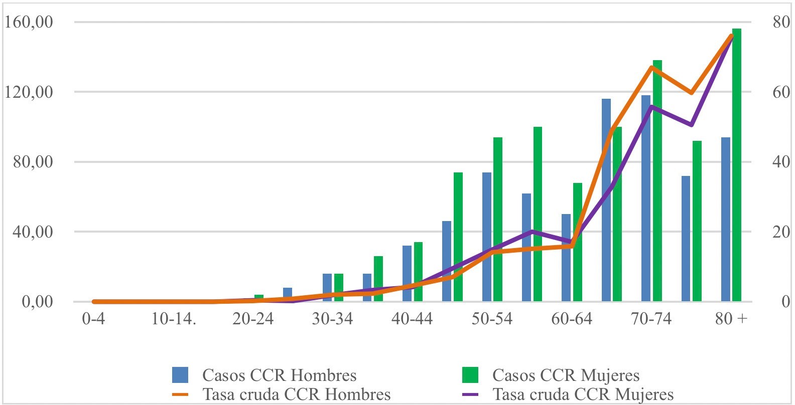 Results. 805 new cases of colorectal cancer were obtained, with an incidence of 14.3 cases in men and 13.5 cases in women per 100,000 inhabitants; the average age of diagnosis was 64 years for both sexes.