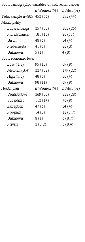8 cases with lymphoma morphology were excluded out of the 813 patients registered with infiltrating colorectal cancer during the study period. In total there were 805 cases with a definitive diagnosis of malignant CRC. 56 % of the cases were women, and the average age at diagnosis for both sexes was 64 years of age. A large part of the inhabitants resided in the municipality of Bucaramanga (57 %), followed by Floridablanca (24 %), of those, 50 % were in the medium socioeconomic level and 61 % of that same population were in the contributive system (Table 1).