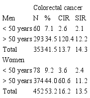 The crude rate for CRC was higher for women (16.2 cases per 100,000 inhabitants) than for men (13.7 cases per 100,000 inhabitants). There was a noted increase in the number of CRC starting at ages 60 - 64, with maximum incidence rates at ages 70 - 74 and over the age of 80. (Figure 2). The SIR for CRC among men was 14.3 cases per 100,000 inhabitants, and for women 13.5 cases per 100,000 inhabitants. Additionally, significantly higher SIR rates were noted after the age of 60 in both sexes (Table 2).