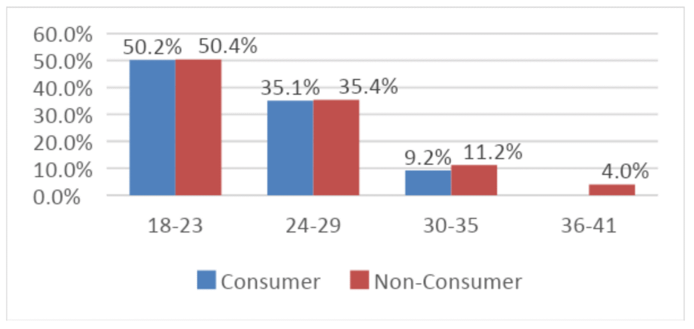 Figure 1 shows the distribution of the sample by age group, with 50.2 % of consumers sample and 50.4 % of non-consumers sample within the first one (18 to 23 years), 35.1 % and 35.4 % from consumers and non-consumers sample, respectively, within 24 to 29 years, 9.2 % (consumers) and 11.2 % (non-consumers) within 30 to 35 years and only 4 % of the non-consumer sample was classified within 36 to 41 years of age.