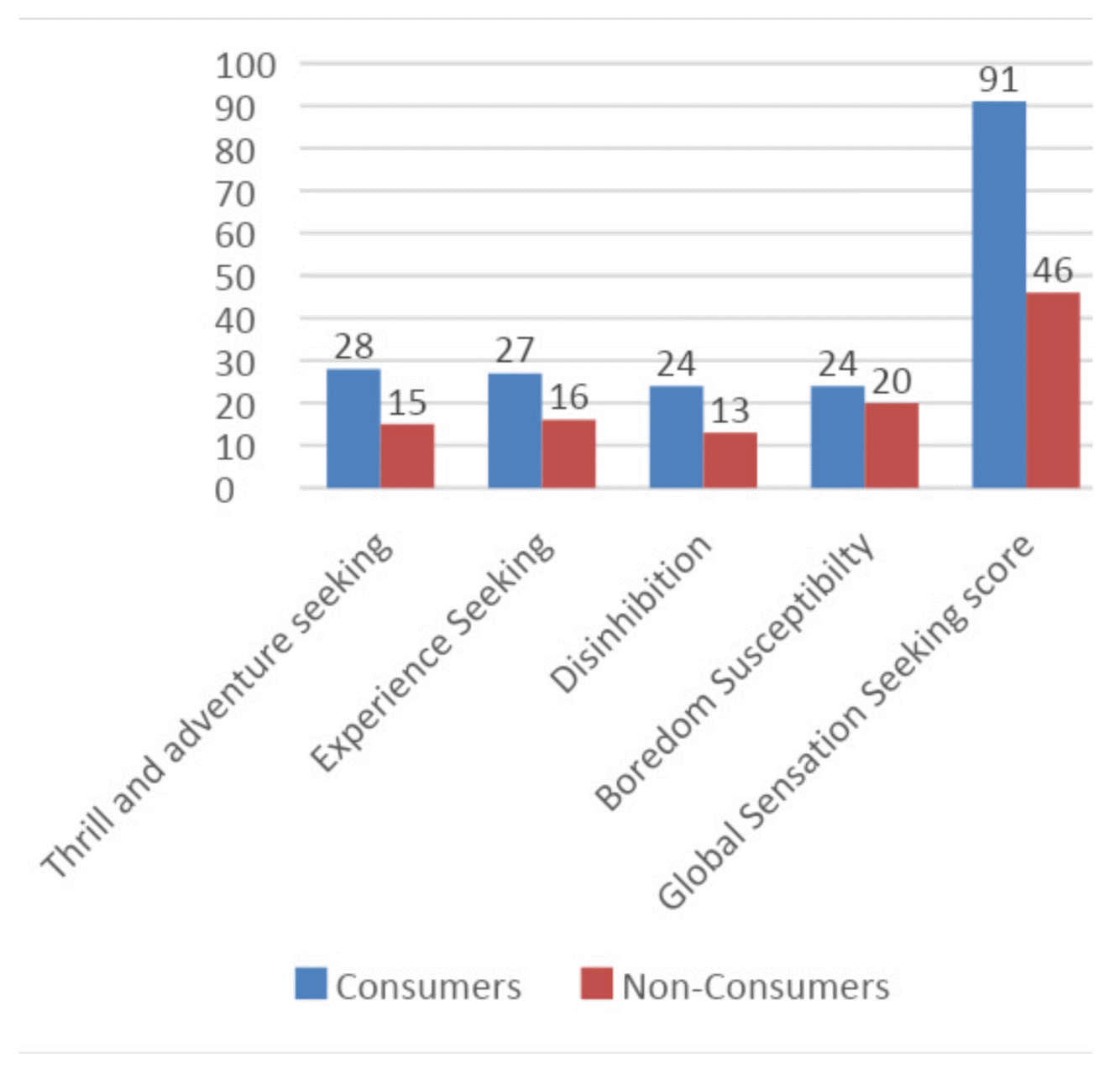 Results. There is a significant difference between consumers and non-consumers within the general scale and three subscales of the trait (Thrill and Adventure Seeking, Experience Seeking and Disinhibition).