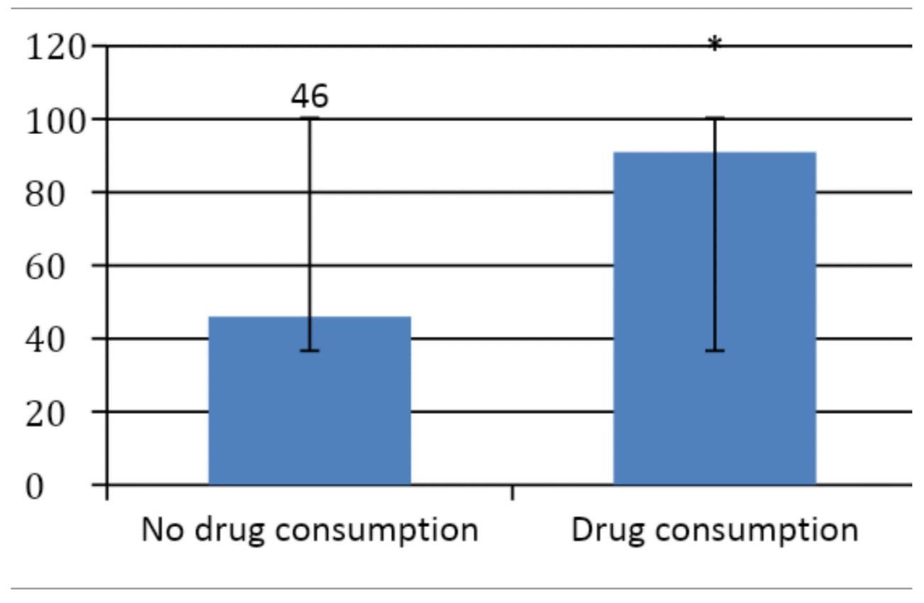 Figure 3. Statistical significance regarding level of Sensation Seeking trait in consumers and non-consumers of psychoactive drugs.