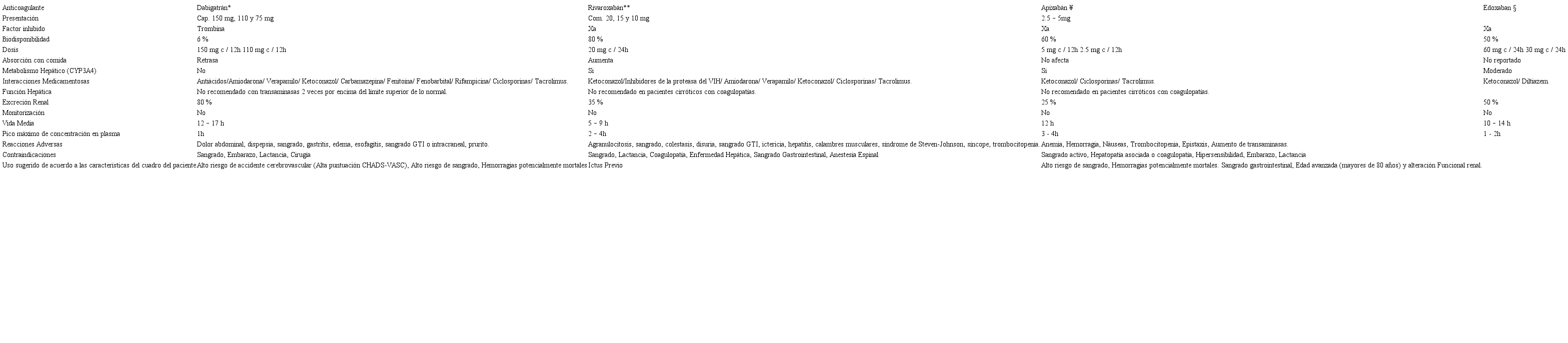 Conclusiones. El uso de nuevos anticoagulantes orales en paciente con fibrilación auricular no valvular es una buena alternativa, con facilidad de administración oral, sin aumento significativo del riesgo de sangrado, comparado con warfarina, con la ventaja de no requerir monitoría continua con paraclínicos.
