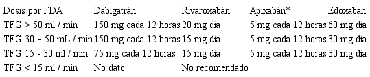 Tabla 4. Administración de nuevos anticoagulantes orales y su dosificación según tasa de filtración glomerular