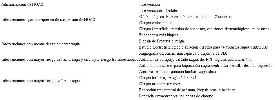 Una situación relativamente frecuente en la actividad clínica es el manejo perioperatorio de pacientes que están en manejo con NACO. Durante los ensayos clínicos de estos medicamentos se presentaron interrupciones en la continuidad del medicamento en un 25 % en el RE-LY, 33 % en el ROCKET - AF y 34 % en el ARISTOTLE (24). Es importante clasificar el tipo de intervención quirúrgica que se le realizará al paciente, ya que hay procedimientos de alto a bajo riesgo de sangrado (Tabla 2), así como conocer la tasa filtración glomerular.