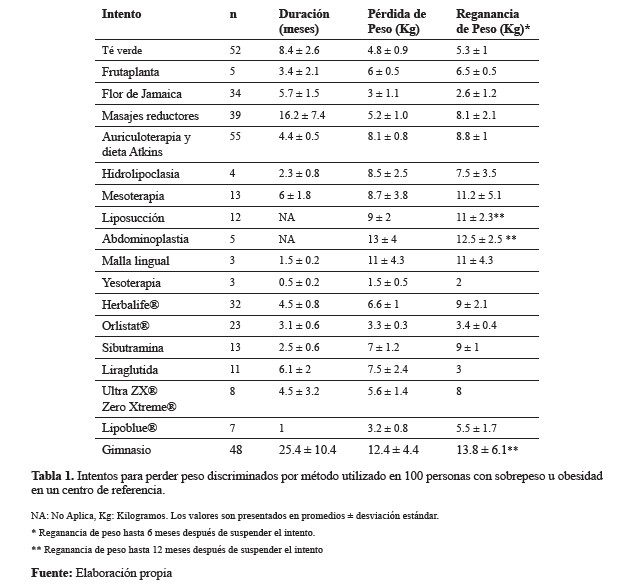 Los pacientes con sobrepeso y obesidad tardan hasta 10 años en consultar al especialista, lo hacen luego de realizar, en promedio, entre 4 y 5 intentos para perder peso. El presente estudio demuestra la gran variedad de métodos autodirigidos que utiliza la población estudiada y enciende las alarmas acerca del uso de estos a pesar de riesgos y advertencias realizadas por entidades gubernamentales. Más aún, se observa que todos los intentos realizados presentaron reganancia del 100% de la pérdida alcanzada, exceptuando el uso de liraglutida, por lo cual el personal de salud que atiende pacientes con obesidad, debe estar familiarizado con las terapias farmacológicas aprobadas para perder peso, así como con aquellos métodos populares, teniendo en cuenta su alto uso y potenciales riesgos.