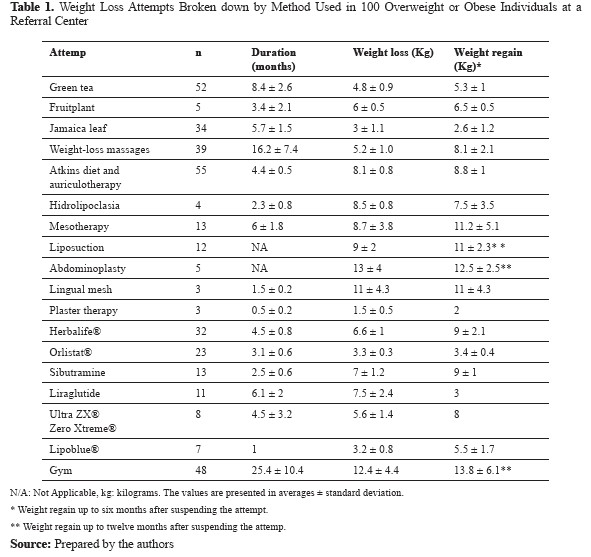 Discussão. As tentativas de perda de peso mais utilizadas pela população avaliada são aquelas que não são aprovadas ou não possuem evidências científicas robustas. Conclusões. Pacientes com sobrepeso e obesos fazem várias tentativas fracassadas de perder peso antes de consultar o especialista. A re-ganancia de peso é frequente, independentemente do tipo de tentativa.