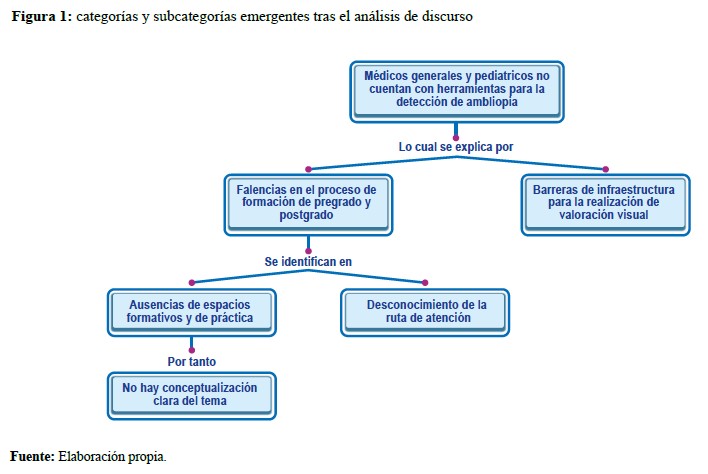 Estas categorías y subcategorías emergen a partir del análisis del discurso de las personas entrevistadas tras la revisión del texto y los aspectos de la última fase del análisis de relativización según Taylor y Bogdan (21). De esta manera, se identifica que los médicos generales y especialistas en pediatría no cuentan con formación académica que les permita realizar una adecuada detección oportuna de las alteraciones visuales y oculares que pueden generar ambliopía, lo cual se explica por la ausencia de espacios formativos específicos en salud visual en el currículo de las escuelas de medicina y de la especialidad, así como la falta de espacios de práctica para el acercamiento al tema. Estos dos elementos tienen unas implicaciones en la práctica clínica, pues no cuentan con herramientas suficientes para la atención de pacientes: se identifican por una parte conceptos erróneos sobre la ambliopía, falta de claridad sobre la edad oportuna para la realización de la valoración visual de primera vez de los pacientes pediátricos, así como imaginarios errados relacionados con la valoración y remisión a servicios especializados de optometría y oftalmología. A estas situaciones se suman las barreras relacionadas con el contexto administrativo en el que se da la prestación de los servicios de salud, pues los profesionales en su práctica cotidiana no cuentan con los recursos tecnológicos necesarios para la detección de alteraciones visuales y/u oculares.