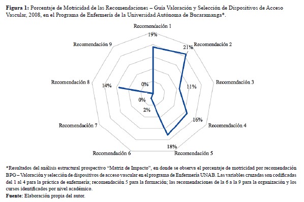 Estos mismos resultados se logran contrastar con el análisis en la medición del impacto de la BPG en el programa de enfermería UNAB, en donde se observa que las recomendaciones para la práctica y la formación presentan una mayor motricidad que las recomendaciones de la organización en los contenidos curriculares (Figura 1).