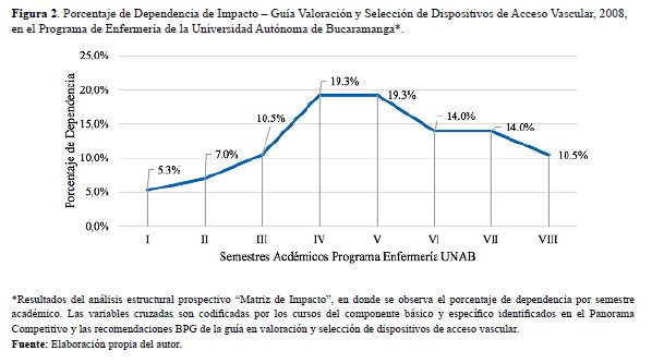 Fuente: Elaboración propia del autor.Figura 2. Porcentaje de Dependencia de Impacto–Guía Valoración y Selección de Dispositivos de Acceso Vascular, 2008, en el Programa de Enfermería de la Universidad Autónoma de Bucaramanga*.