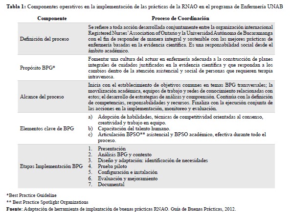 Tabla 1: Componentes operativos en la implementación de las prácticas de la RNAO en el programa de Enfermería UNAB