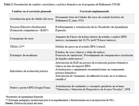 Fuente: Elaboración propia del autor.Tabla 2. Presentación de cambios curriculares y práctica formativa en el programa de Enfermería UNAB.