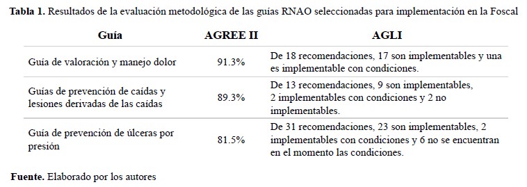 Tabla 1. Resultados de la evaluación metodológica de las guías RNAO seleccionadas para implementación en la Foscal