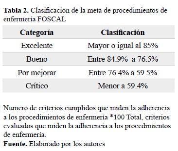 Tabla 2. Clasificación de la meta de procedimientos de enfermería FOSCAL