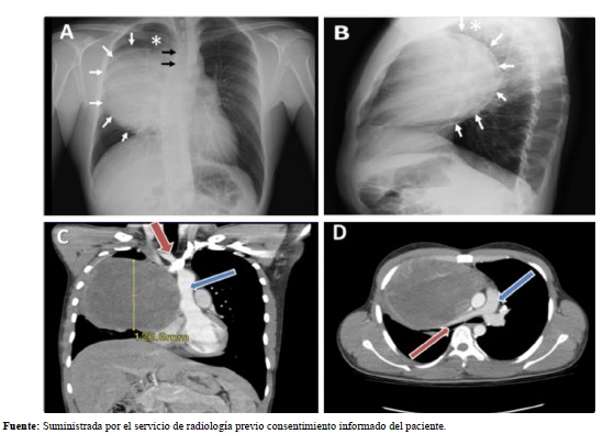 Resumo: Figuras A e B: Radiografia de tórax (anteroposterior (AP) e lateral). Presença de grande massa, aparentemente do mediastino médio (Setas brancas), diâmetros de 11 x 15 x 12 cm, densidade homogênea, com efeito de massa em outras estruturas mediastinais (setas pretas) e compressão no lobo superior direito (*), sem calcificações internas. Figura C. Tomografia computadorizada de tórax, corte coronal. No mediastino anterior, mostra uma massa hipodensa e heterogênea, com predominância da densidade de partes moles, com algumas calcificações internas, diâmetros de 14,3 x 10,2 x 12,6 (Linha amarela) cm, deslocando a aorta ascendente (seta azul), a seta vermelha indica o tronco braquiocefálico. Figura D. Tomografia computadorizada de tórax, corte axial. Massa hipodensa, heterogênea, com predominância da densidade de partes moles, com algumas calcificações internas, que ocupam grande parte do hemitórax anterior direito. Também está deslocando estruturas mediastinais, como o tronco da artéria pulmonar (Seta azul), essa massa está gerando atelectasia passiva do lobo médio direito (Sseta vermelha). Cómo citar. López-Salazar JP, Delgado-Serrano J. Tumor mediastinal de células germinales en un paciente con melanoptisis. MedUNAB. 2020;23(2): 191-194. doi:10.29375/01237047.3748