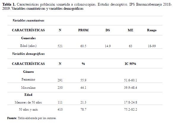 Tabla 1. Características población sometida a colonoscopías. Estudio descriptivo. IPS Barrancabermeja 2018-2019. Variables cuantitativas y variables demográficas