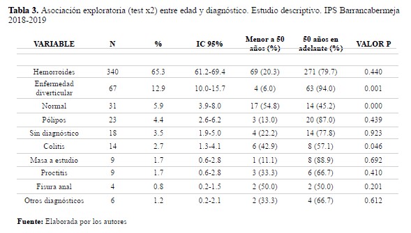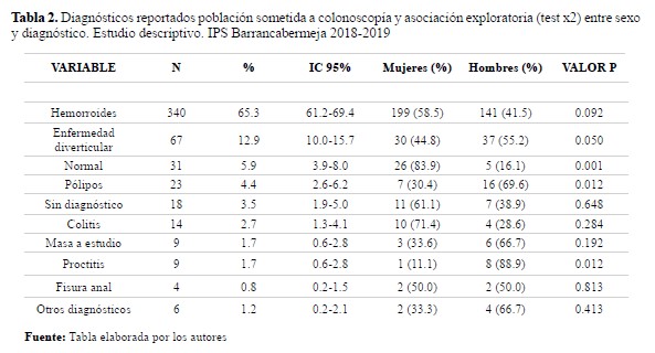 Estudio observacional, transversal con componente analítico. La información se recolectó de manera retrospectiva, la población estuvo constituida por todos los pacientes mayores de 18 años de ambos sexos, a quienes se les realizó colonoscopía de forma ambulatoria o con hospitalización, en una institución prestadora de servicios de salud de segundo nivel, entre los meses de enero de 2018 y abril de 2019. De esta población se seleccionaron 521 pacientes, 230 del sexo femenino y 291 del sexo masculino. Para la obtención de los datos necesarios se revisaron los informes colonoscópicos, tomando las variables disponibles y que se tuvieron en cuenta como edad, sexo y el diagnóstico respectivo. Las variables cualitativas (sexo y diagnóstico) se presentaron en forma de frecuencias y porcentajes y las cuantitativas en medianas y rangos, aunque la edad se categorizó en menores de 50 años y de 50 años en adelante. Para el análisis bivariado se utilizó la prueba de ji cuadrado (test x2) y en caso necesario el test exacto de Fisher; los cálculos se realizaron con el software Stata v14 (Stata©).