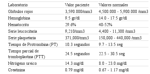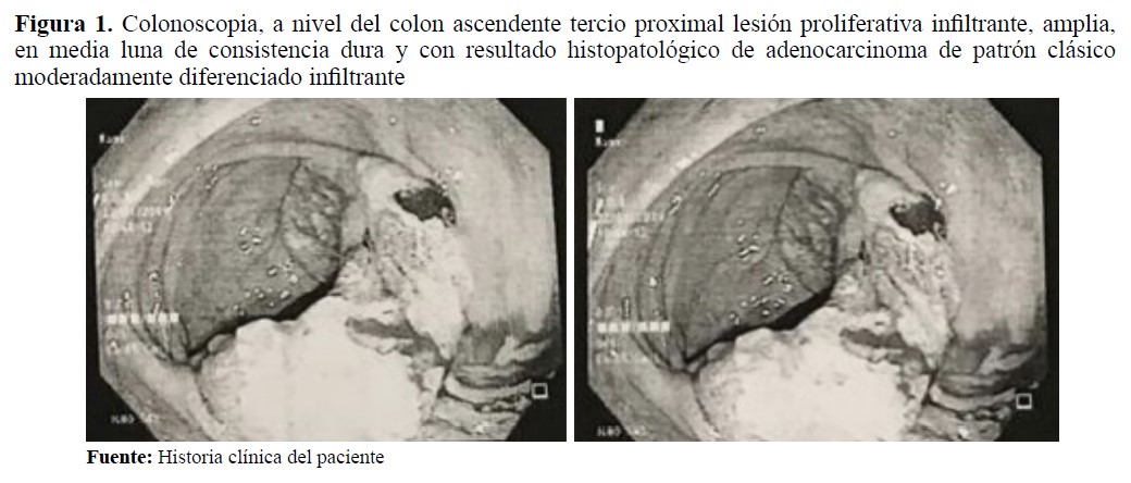 Paciente femenina de 86 años con antecedentes de hipertensión arterial y gastritis crónica atrófica, con cuadro de seis meses de evolución de dolor abdominal en flanco derecho, adinamia y pérdida de peso no cuantificada, motivo por el cual consulta a medicina general, desde donde se remite una colonoscopia que evidencia lesión proliferativa infiltrante amplia a nivel de tercio proximal colon ascendente (Figura 1). Resultado histopatológico de adenocarcinoma de patrón clásico moderadamente diferenciado infiltrante. Estudio complementario con TC abdominal que demuestra engrosamiento infiltrativo de las paredes del ciego, de probable naturaleza neoplásica con compromiso de la unión ileocecal y de ganglios pericecales (Figura 2). Los paraclínicos prequirúrgicos (Tabla 1) informaron anemia moderada. Valorada por cirugía general en donde se decide realizar tratamiento quirúrgico Hemicolectomía derecha radical.
