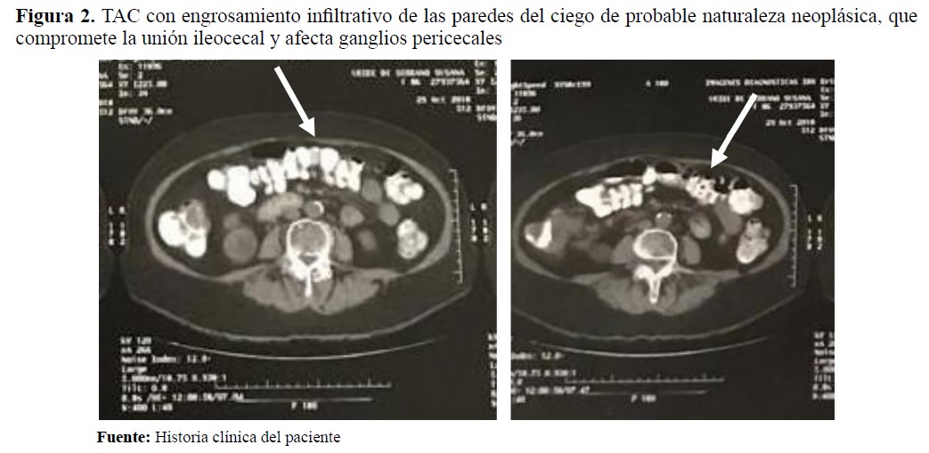 Figura 2. TAC con engrosamiento infiltrativo de las paredes del ciego de probable naturaleza neoplásica, que compromete la unión ileocecal y afecta ganglios pericecales