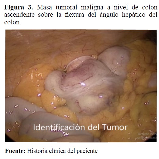 Con respecto a la técnica quirúrgica, se practica una exploración laparoscópica por puerto de visión ubicado a nivel umbilical. Se identifica una masa tumoral maligna a nivel de colon ascendente (Figura 3). Macroscópicamente no se observa tumor en la serosa. Al comprobar que no existen contraindicaciones para continuar con esta técnica y que la lesión es resecable, se procede a colocar otros dos puertos, todos en línea media. El autor utiliza la línea media como medida para evitar pasar por los músculos de la pared abdominal y así evitar el dolor y sangrado postoperatorio. El equipo quirúrgico está ubicado al lado izquierdo del paciente y la torre de laparoscopia al lado derecho. Se practica una incisión en fascia de Toldt con la disección clásica de maniobra de Catell y con movilización medial del colon derecho hasta visualizar el riñón derecho, el duodeno, el uréter derecho y la vena cava inferior. De esta manera se garantiza la radicalidad del procedimiento. Esta maniobra levanta el mesocolon derecho hasta la raíz del mesenterio, dando facilidad a la identificación de la arteria cólica derecha. Esta, junto con su vena, se secciona entre clips metálicos. Después de la liberación del ángulo hepático del colon, la disección se lleva hasta el colon transverso a nivel de la cólica media, la cual se preserva. Se disecan los límites de resección dados por el íleon distal y el colon transverso. Se efectúa resección con endograpadora lineal de 45 mm, recarga de 2.5 mm para tejido normal. Un corte en el íleon y otro a nivel del colon transverso. La pieza quirúrgica se introduce en bolsa de manejo de tejidos intracorpóreos (Endo Bag) con lo cual se evita contaminación neoplásica de otros tejidos, especialmente a nivel del puerto de salida.