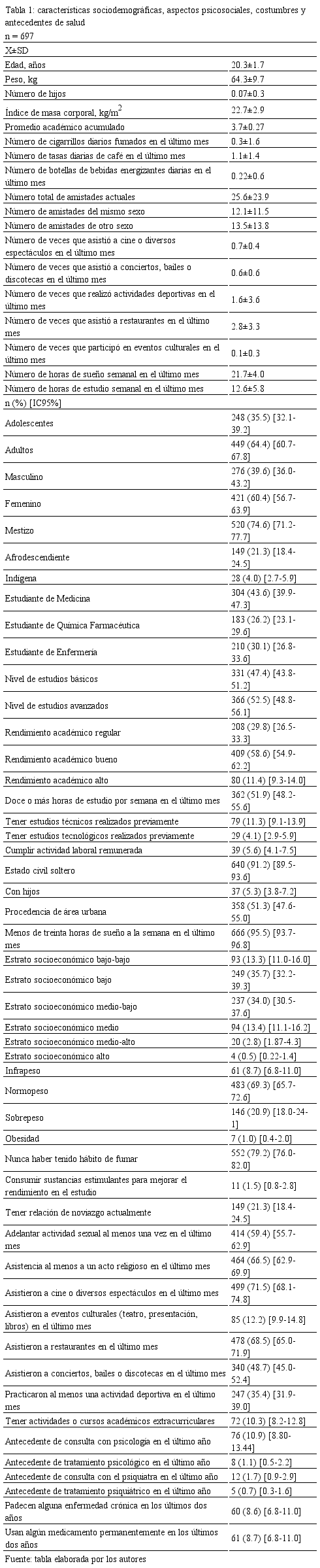 De los 712 formularios aplicados, 15 fueron “descartados” (seis de Medicina, tres de Química Farmacéutica, cuatro de Enfermería y dos con facultad de estudios no informada). Se evaluaron 697 estudiantes, 12.6% por encima del tamaño de la muestra. Del total de la muestra, 276 (39.6%) eran hombres y 421 (60.4%) mujeres, la edad promedio fue de 20.3±1.7, e IMC 22.7±2.9. El 43.6% estudiaba Medicina, mientras que el 26.2% y el 30.1%, estudiaban Química Farmacéutica y Enfermería, respectivamente. La mayoría cursaba tercer semestre: 91 (13.0%) (IC95%:10.7-15.7), y la minoría décimo: 67 (9.6%) (IC95%:7.6-12.0). No se observó diferencia significativa en la distribución por semestres de estudio. Las características sociodemográficas, aspectos psicosociales, costumbres y antecedentes de salud se presentan en la tabla 1.