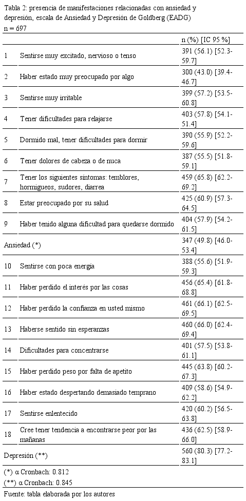 Tabla 2. Presencia de manifestaciones relacionadas con ansiedad y depresión, escala de Ansiedad y Depresión de Goldberg (EADG)