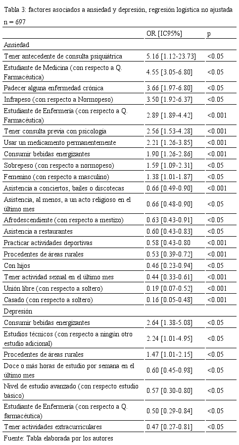 Tabla 3. Factores asociados a ansiedad y depresión, regresión logística no ajustada