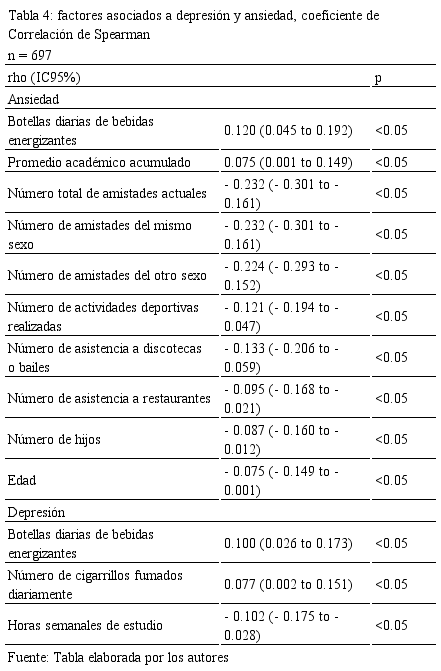 Tabla 4. Factores asociados a depresión y ansiedad, coeficiente de Correlación de Spearman