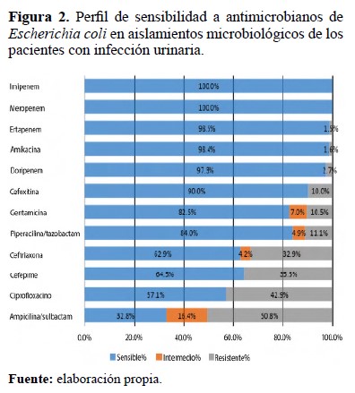 Figura 2. Perfil de sensibilidad a antimicrobianos de Escherichia coli en aislamientos microbiológicos de los pacientes con infección urinaria.