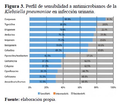 Figura 3. Perfil de sensibilidad a antimicrobianos de la Klebsiella pneumoniae en infección urinaria.