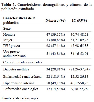Se incluyeron 120 pacientes con diagnóstico de IVU atendidos en el servicio de urgencias de la institución. El grupo tenía una edad promedio 65 años y era predominantemente femenino. De estos pacientes, la mayoría tenía antecedente de infección urinaria, y la comorbilidad sistémica más frecuente fue la hipertensión arterial, entre otras como la diabetes mellitus y la enfermedad renal crónica. Las características demográficas y clínicas se describen en la tabla 1.