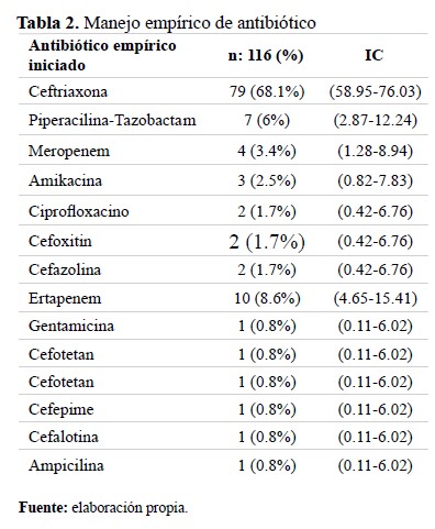 En latabla 2 se observan los medicamentos instaurados en Urgencias. El medicamento antibiótico más usado fue la Ceftriaxona, presente en el 68.4% de los casos, seguido por el Ertapenem, con una frecuencia del 8.6%.