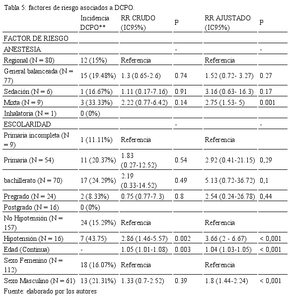 A los pacientes que cumplían con los criterios se les registraron los datos sociodemográficos con las variables: edad, sexo, peso, talla, índice de masa corporal (IMC, tipo de anestesia, tiempo de anestesia, escolaridad, ASA, clase funcional definida por la actividad física del paciente, medicamentos, diagnóstico prequirúrgico, antecedentes patológicos y monitoria completa. Se empleó un análisis estadístico multivariado para determinar los diferentes factores de riesgo de DCOP.