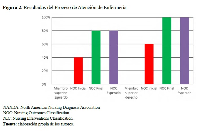 Los resultados obtenidos conforme al NOC inicial, final y esperado se describen en la Figura 2, enfatizando que para el miembro superior izquierdo se logró el 80% y para el miembro superior derecho el 100% cumpliendo con los puntajes esperados y la mejoría del sujeto de cuidado.